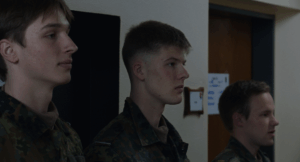 DIE UNIFORMIERTEN wiederum leben eine ganz eigene Ordnung: die bewusste Gleichmachung. „Meine Position ist vorne links“, erklärt ein Soldat aus dem Off. Für ihn ist es ein rein praktischer Hinweis, denn diese Position gibt beim Marsch den Rhythmus vor. Für das Publikum ist es eine notwendige Orientierung: In der uniformierten Masse schwindet die optische Differenz. Wir benötigen Koordinaten, um das Individuum überhaupt noch lokalisieren zu können. Nach und nach gewöhnt sich das Auge an die Camouflage und einzelne Personen lösen sich aus dem Muster.