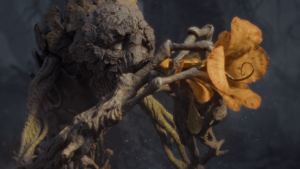 Back on Earth, the branches are groaning, the woods are creaking, and dark grey clouds hang over the trees. A deep, wooden note hums through the thicket. It is a melody from a blossoming magic flute, breathing life back into the WOODLAND with its warmth.